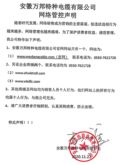 鄭重聲明:安徽萬邦特種電纜有限公司官方網站為:www_wanbangcable_com.qnv0t.cn,除此之外無任何子網站或合作網站,其余均為假冒偽劣。電話:0550-7621728 13485756353 地 址:安徽省天長市滁州高新技術產業開發區經四路29號